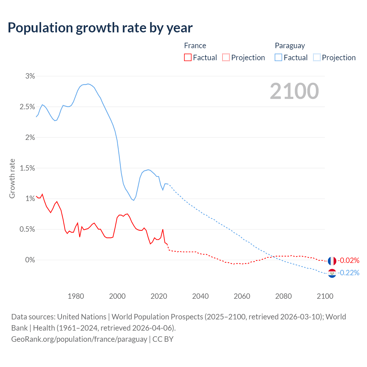 - For the last 10 years, France has had an average growth rate of +0.35% per year vs +1.34% in Paraguay.