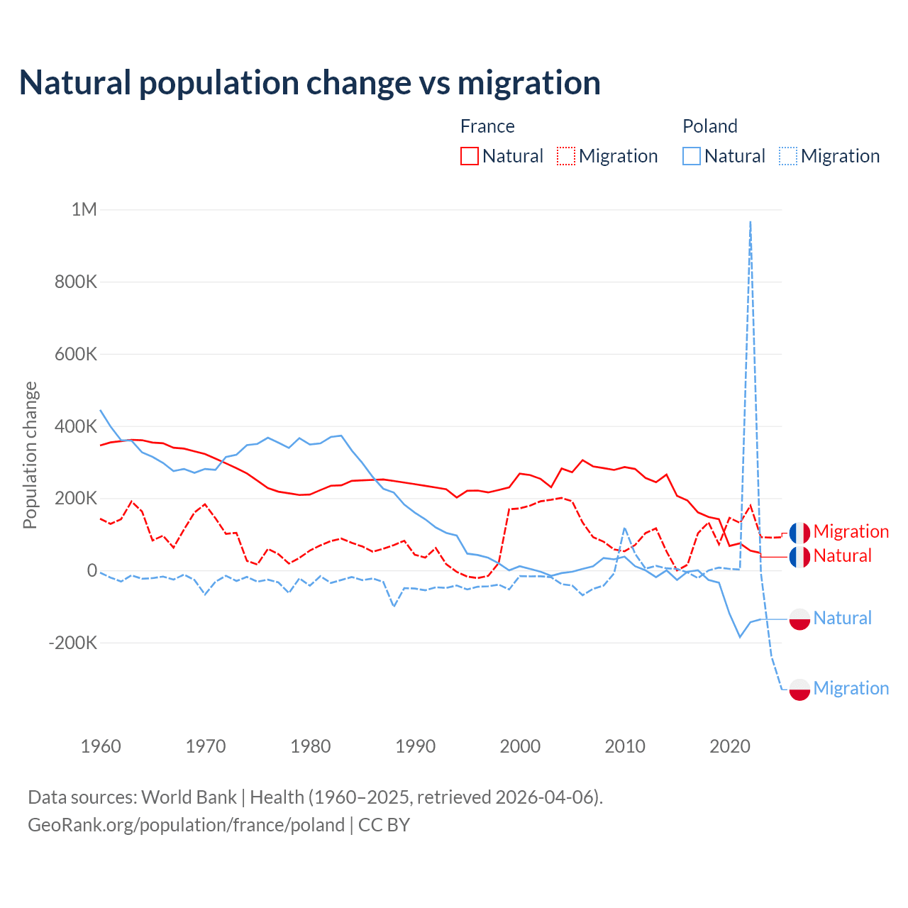 Over the last 10 years, 59.5% of the population change in France is from natural causes (a gain of 1,359,540 people) and 40.5% is from migration (a gain of 923,723 people). In Poland 41.4% is from natural causes (a loss of 675,443 people) and 58.6% is from migration (a gain of 955,766 people).
