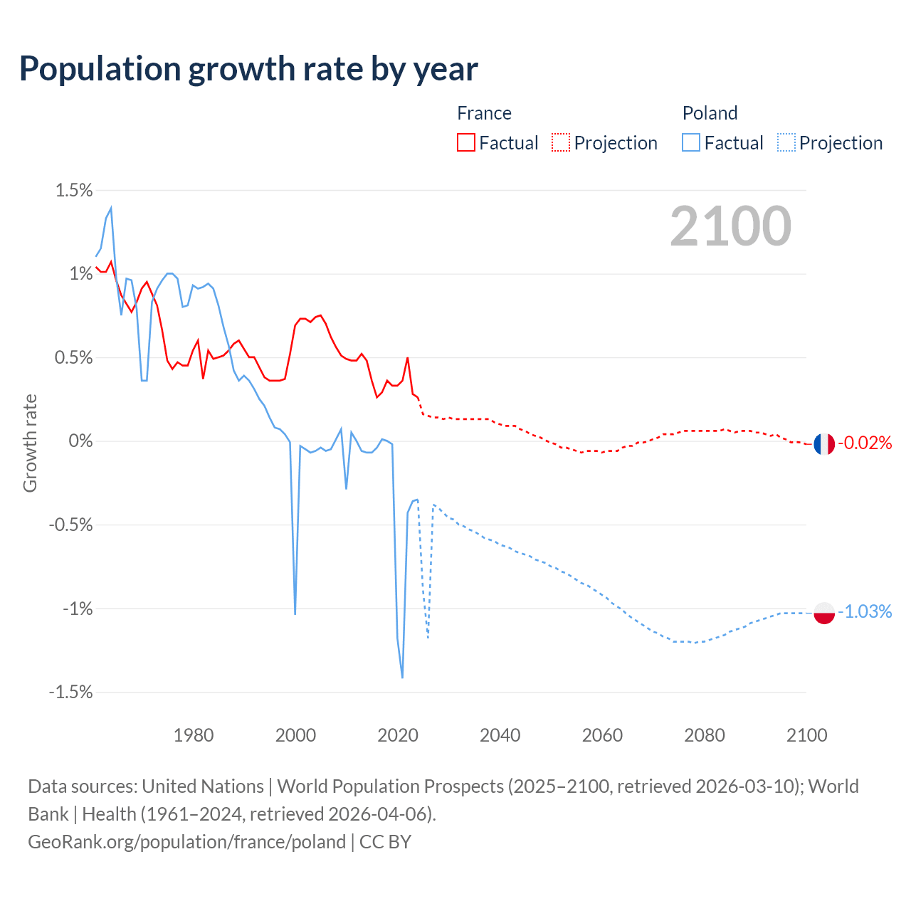 - For the last 10 years, France has had an average growth rate of +0.35% per year vs -0.36% in Poland.