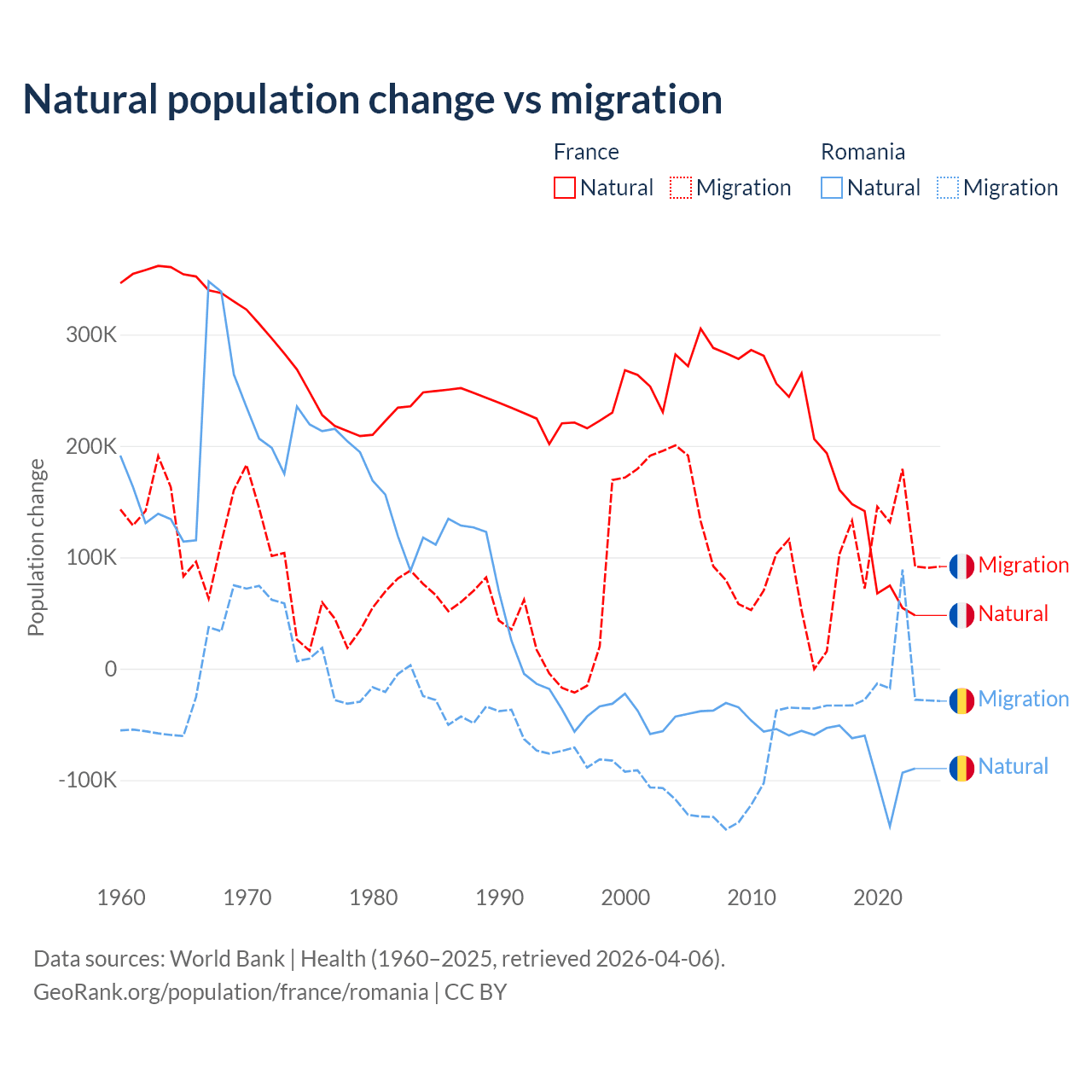Over the last 10 years, 59.5% of the population change in France is from natural causes (a gain of 1,359,540 people) and 40.5% is from migration (a gain of 923,723 people). In Romania 82% is from natural causes (a loss of 766,295 people) and 18% is from migration (a loss of 167,917 people).
