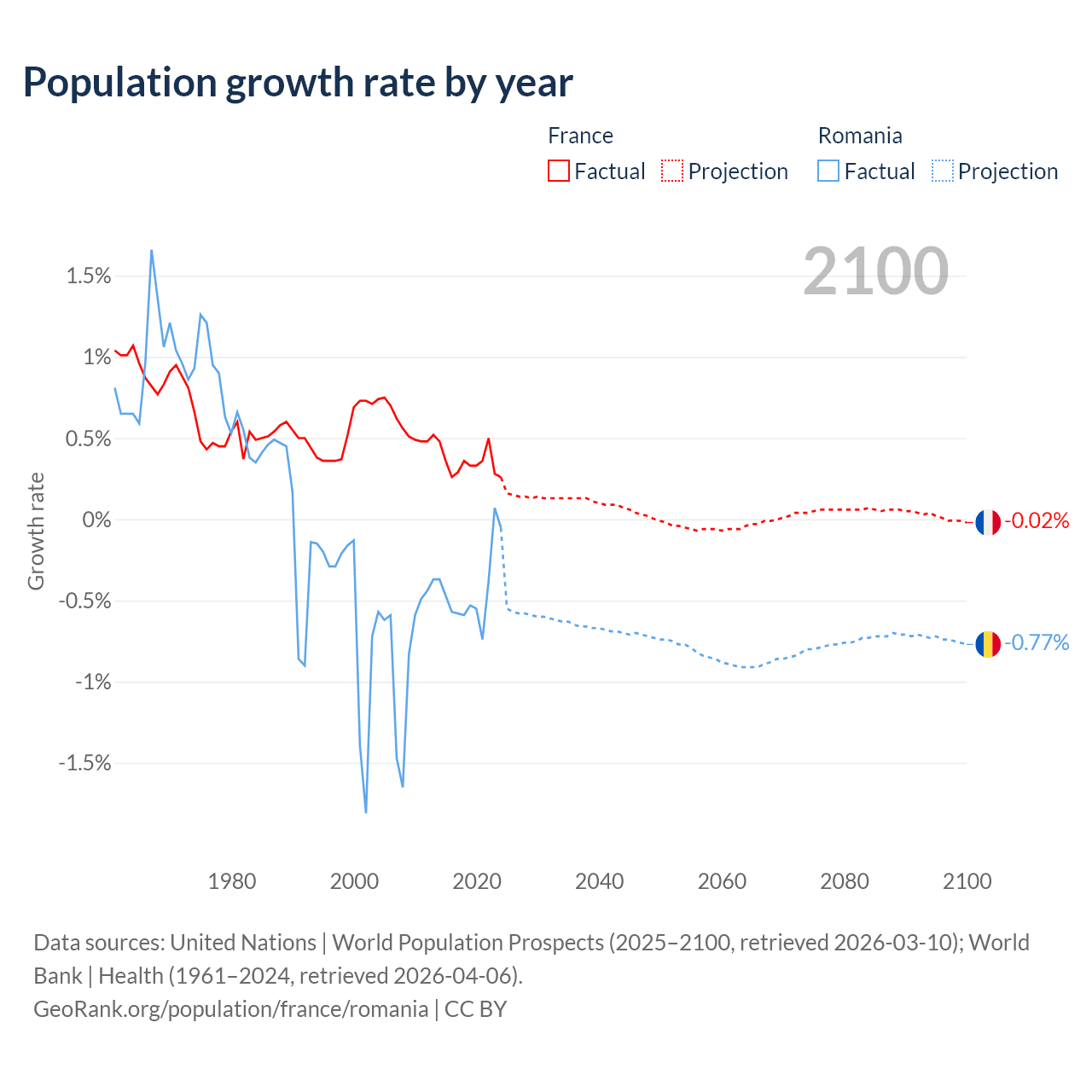 - For the last 10 years, France has had an average growth rate of +0.35% per year vs -0.43% in Romania.