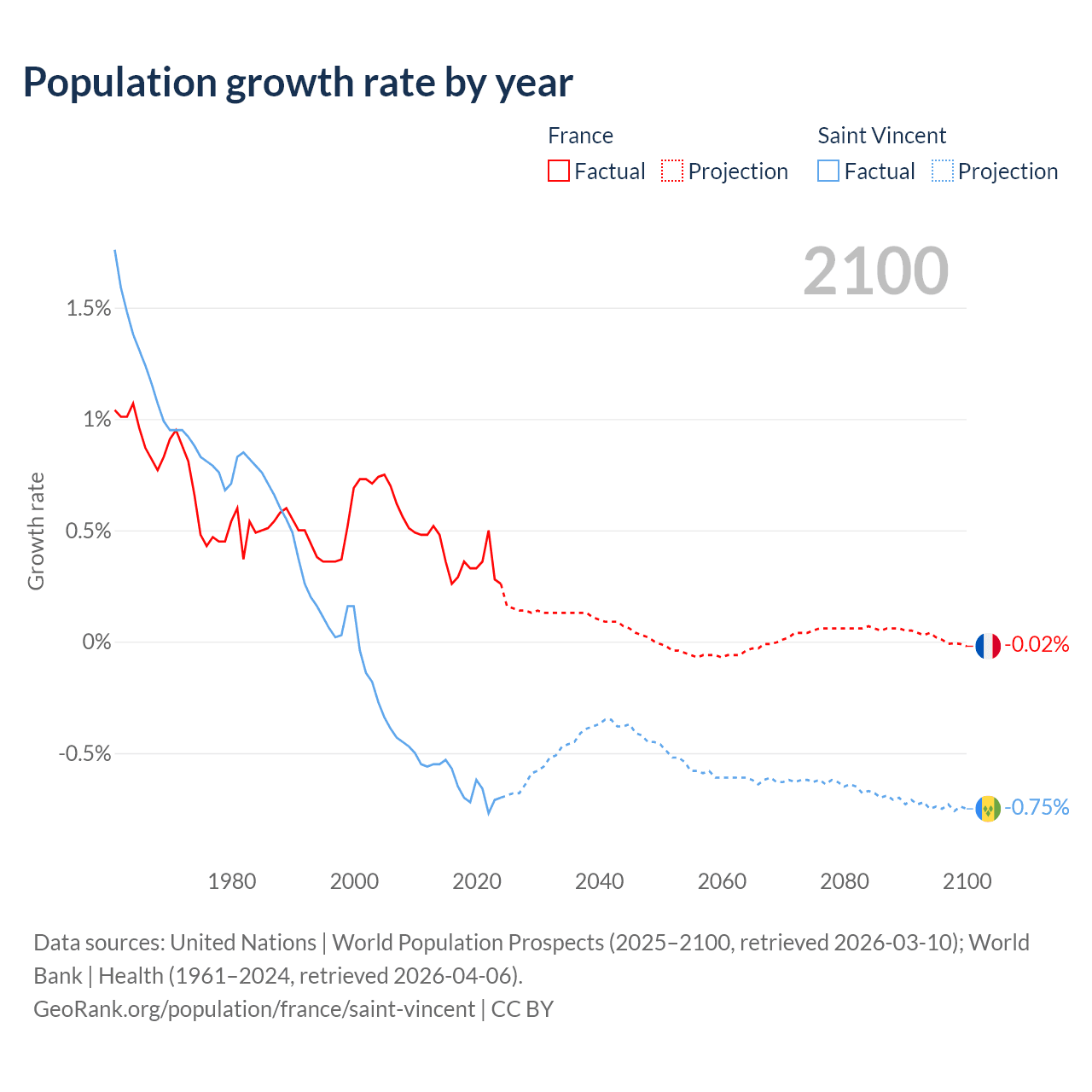 - For the last 10 years, France has had an average growth rate of +0.35% per year vs -0.65% in Saint Vincent.