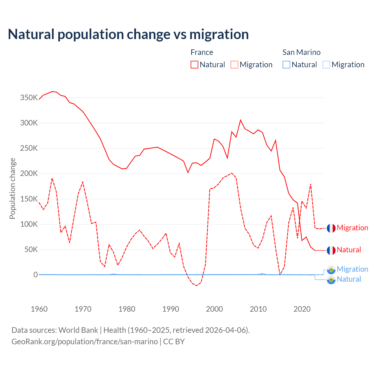 Over the last 10 years, 59.5% of the population change in France is from natural causes (a gain of 1,359,540 people) and 40.5% is from migration (a gain of 923,723 people). In San Marino 40.9% is from natural causes (a loss of 358 people) and 59.1% is from migration (a gain of 517 people).