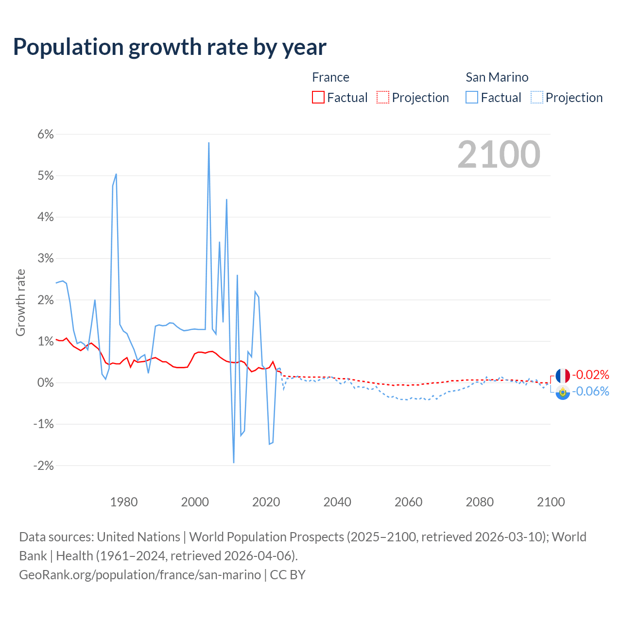 France vs San Marino: population by year and forecast