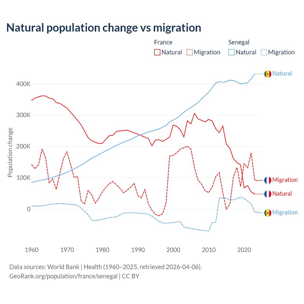 Over the last 10 years, 59.5% of the population change in France is from natural causes (a gain of 1,359,540 people) and 40.5% is from migration (a gain of 923,723 people). In Senegal 93.9% is from natural causes (a gain of 4,089,205 people) and 6.13% is from migration (a gain of 267,266 people).