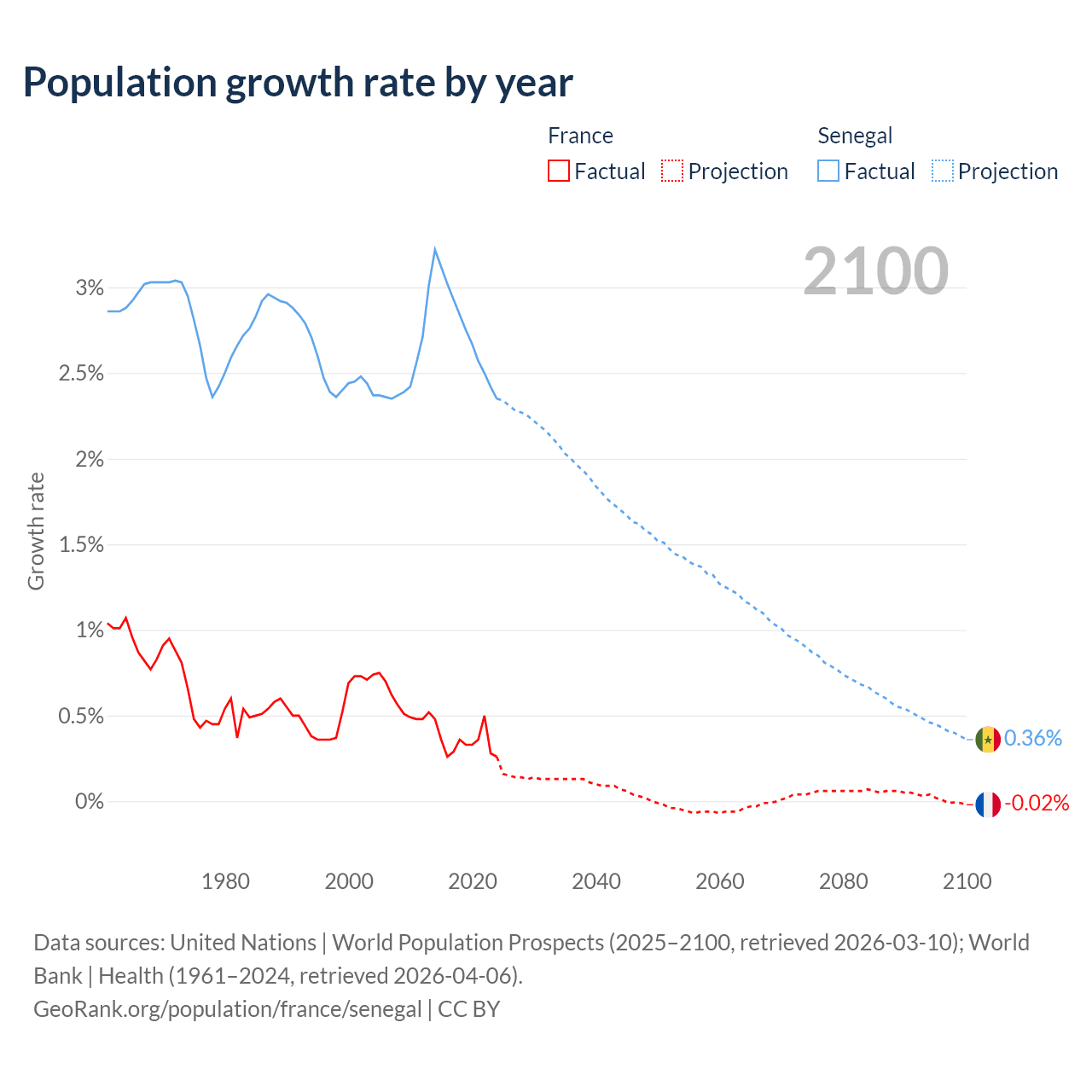 - For the last 10 years, France has had an average growth rate of +0.35% per year vs +2.76% in Senegal.