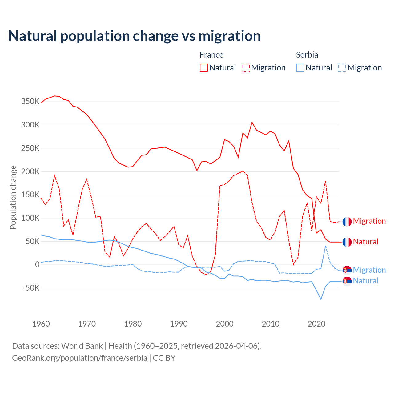 Over the last 10 years, 59.5% of the population change in France is from natural causes (a gain of 1,359,540 people) and 40.5% is from migration (a gain of 923,723 people). In Serbia 83.3% is from natural causes (a loss of 435,148 people) and 16.7% is from migration (a loss of 87,110 people).