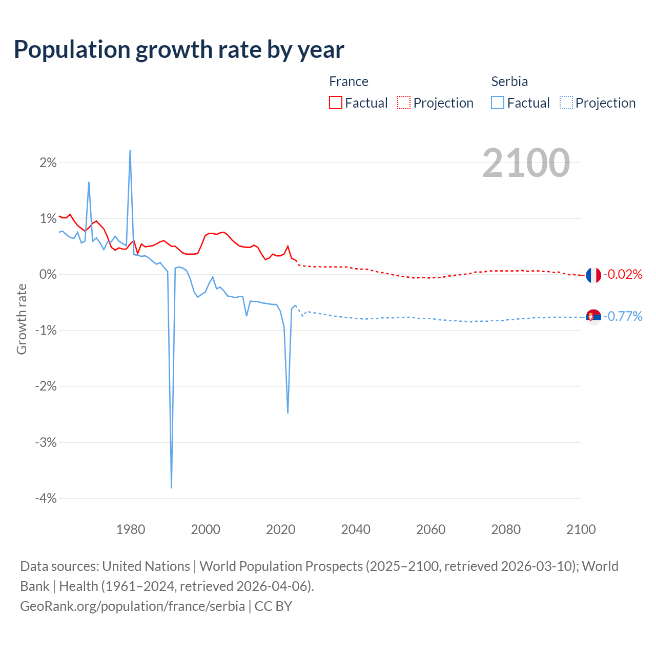 - For the last 10 years, France has had an average growth rate of +0.35% per year vs -0.76% in Serbia.