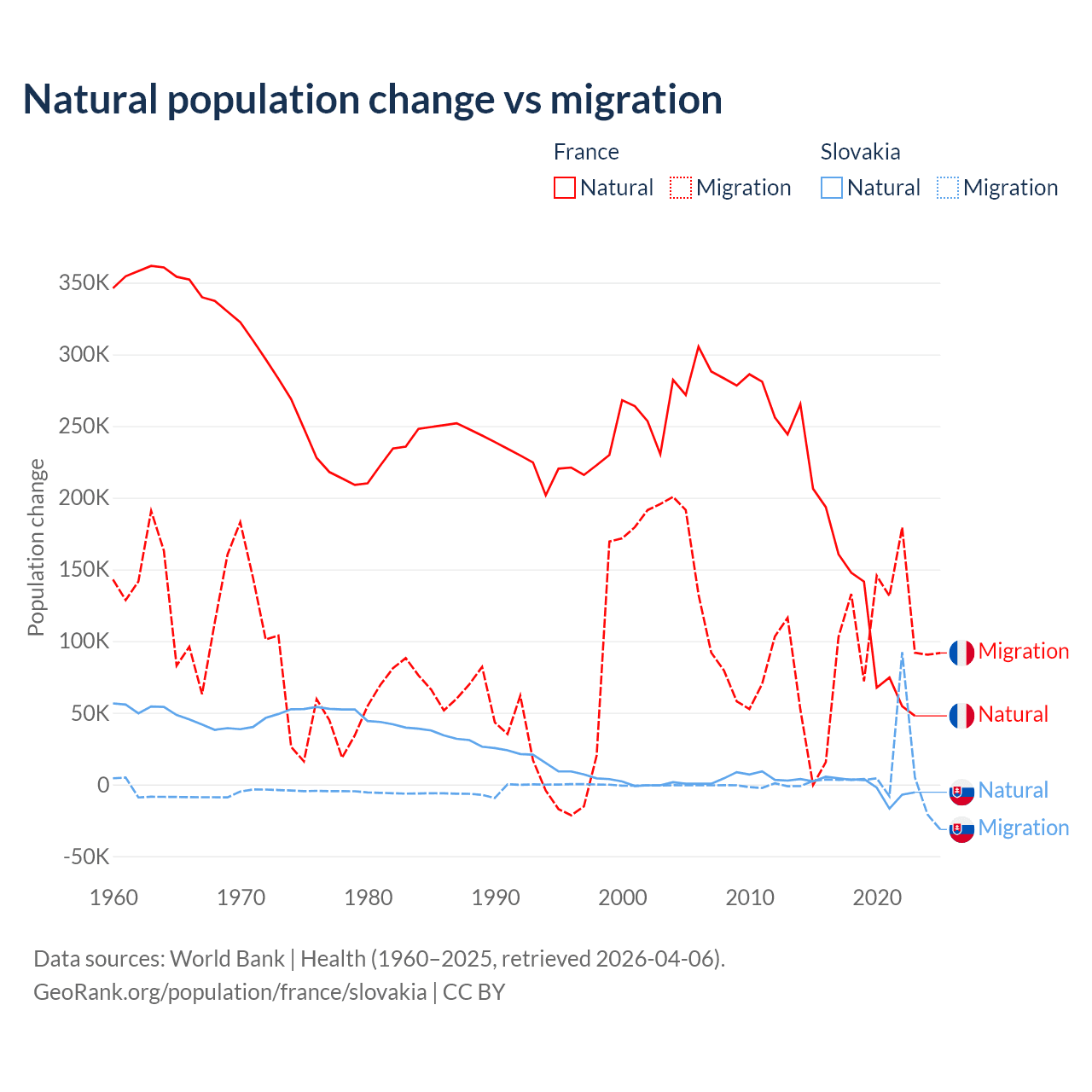 Over the last 10 years, 59.5% of the population change in France is from natural causes (a gain of 1,359,540 people) and 40.5% is from migration (a gain of 923,723 people). In Slovakia 7.47% is from natural causes (a loss of 8,728 people) and 92.5% is from migration (a gain of 108,156 people).