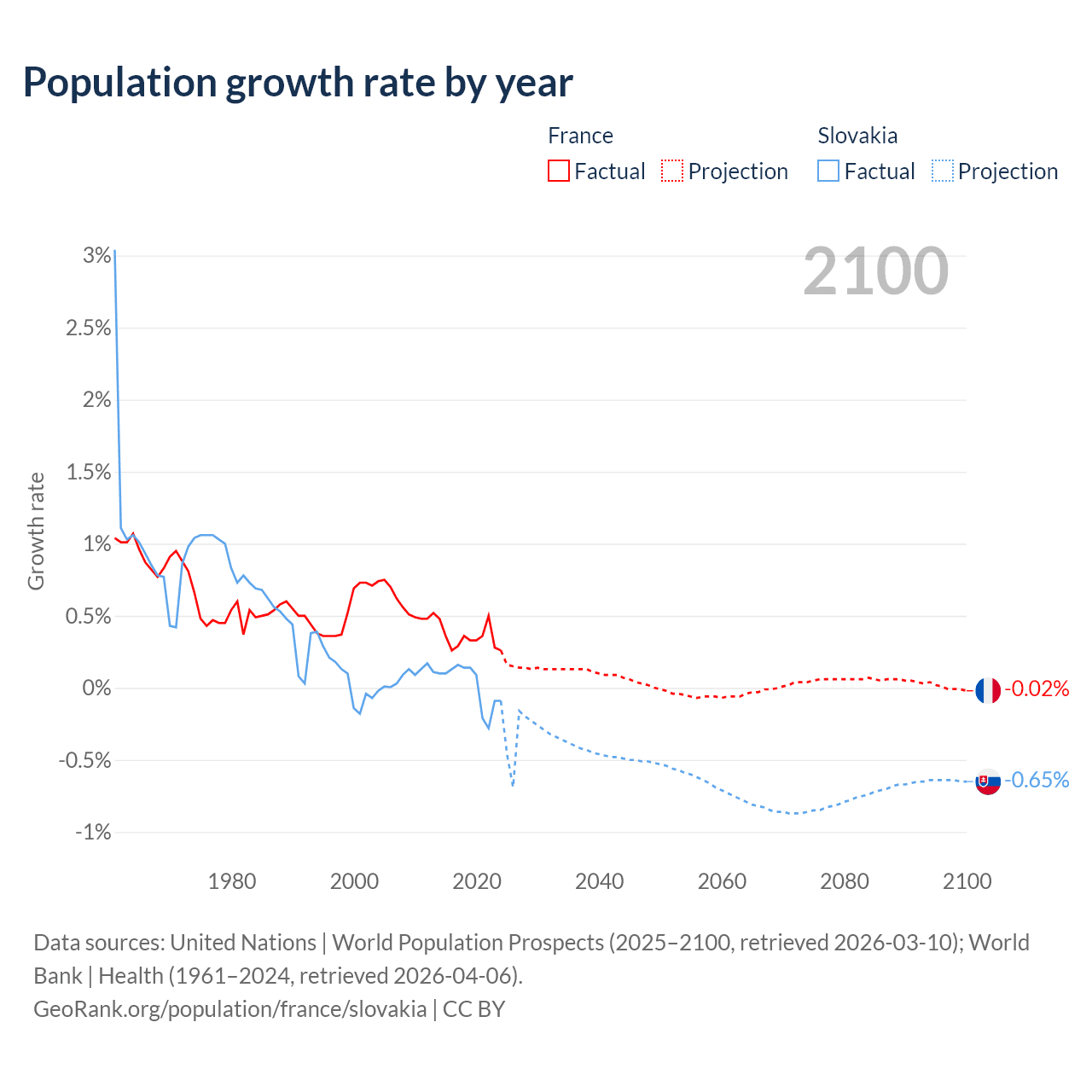 - For the last 10 years, France has had an average growth rate of +0.35% per year vs +0.01% in Slovakia.