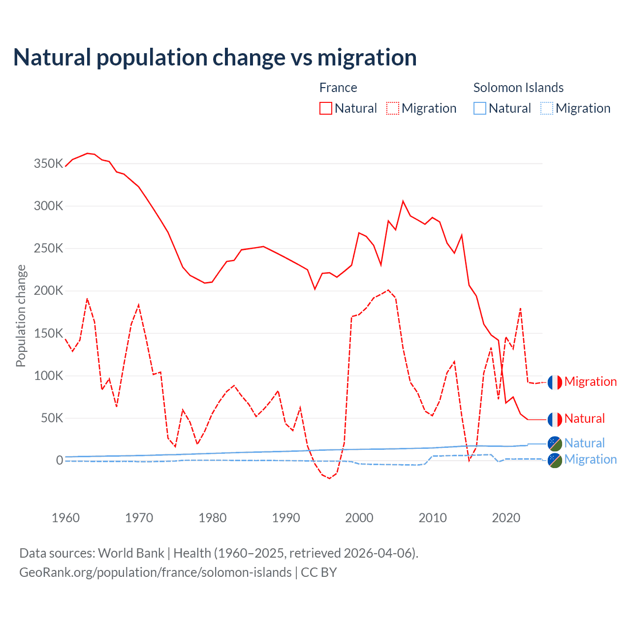 Over the last 10 years, 59.5% of the population change in France is from natural causes (a gain of 1,359,540 people) and 40.5% is from migration (a gain of 923,723 people). In the Solomon Islands 82.8% is from natural causes (a gain of 168,727 people) and 17.2% is from migration (a gain of 35,031 people).