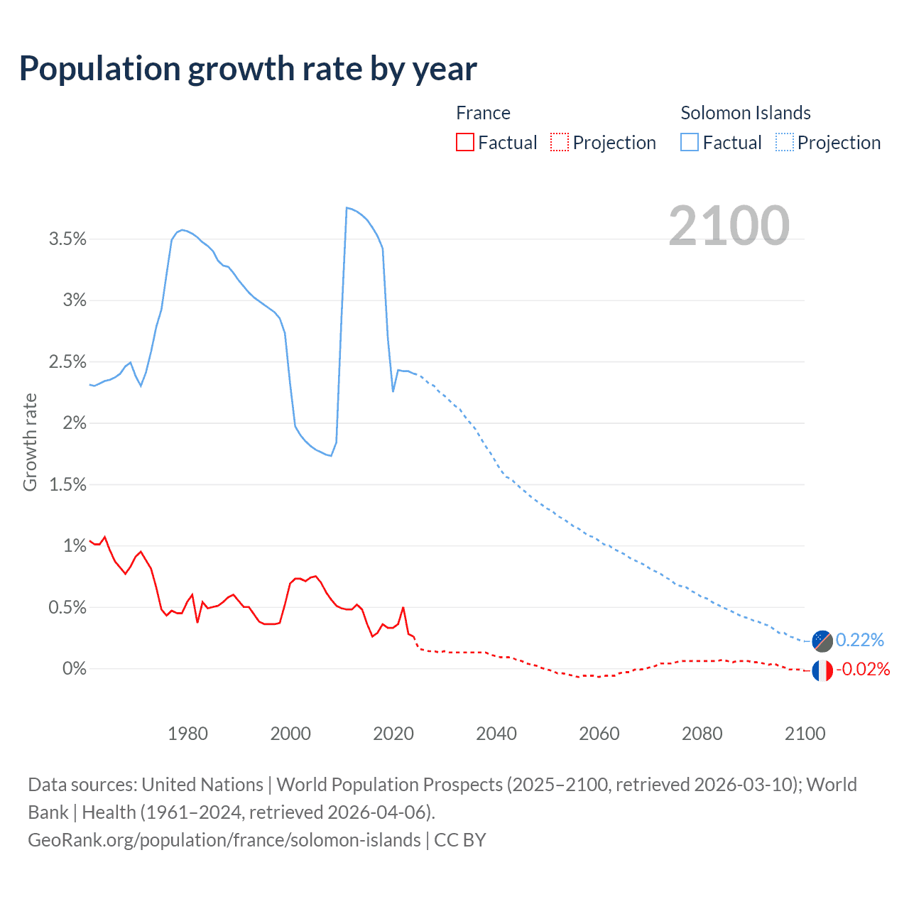 - For the last 10 years, France has had an average growth rate of +0.35% per year vs +2.95% in the Solomon Islands.