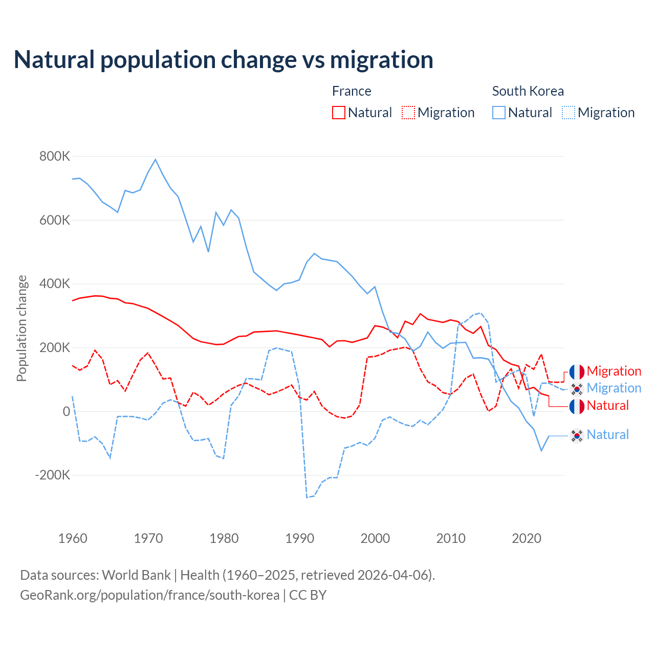 Over the last 10 years, 59.5% of the population change in France is from natural causes (a gain of 1,359,540 people) and 40.5% is from migration (a gain of 923,723 people). In South Korea 17.6% is from natural causes (a gain of 277,215 people) and 82.4% is from migration (a gain of 1,298,356 people).