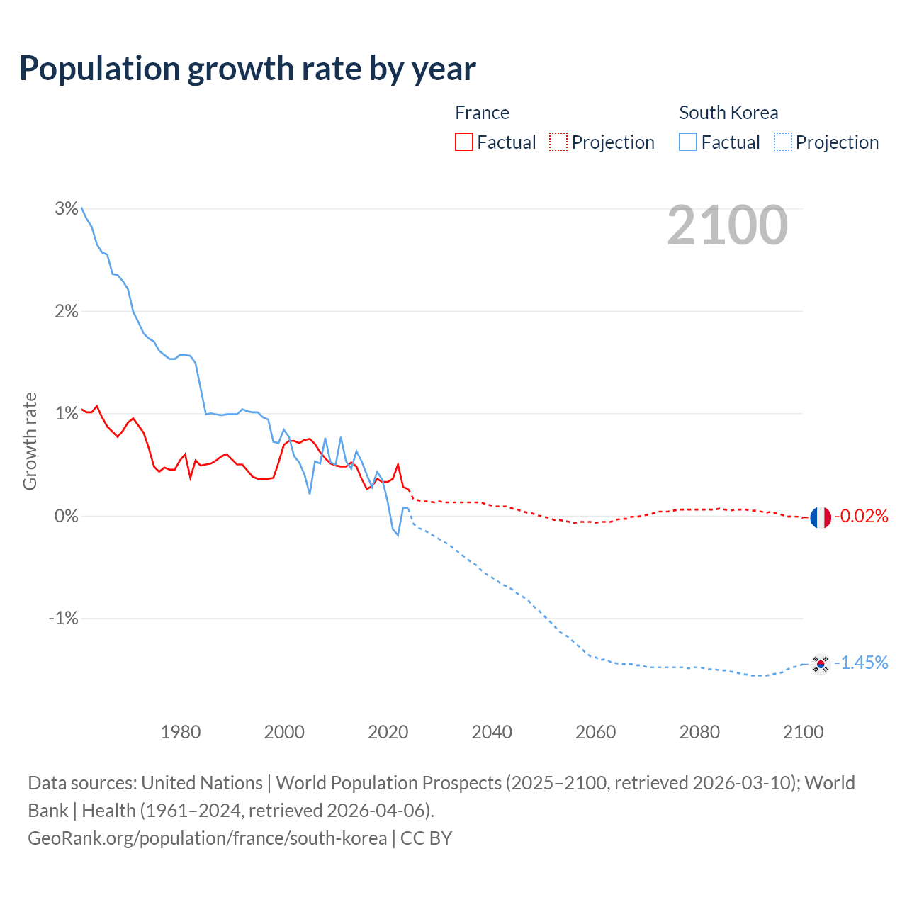 - For the last 10 years, France has had an average growth rate of +0.35% per year vs +0.24% in South Korea.