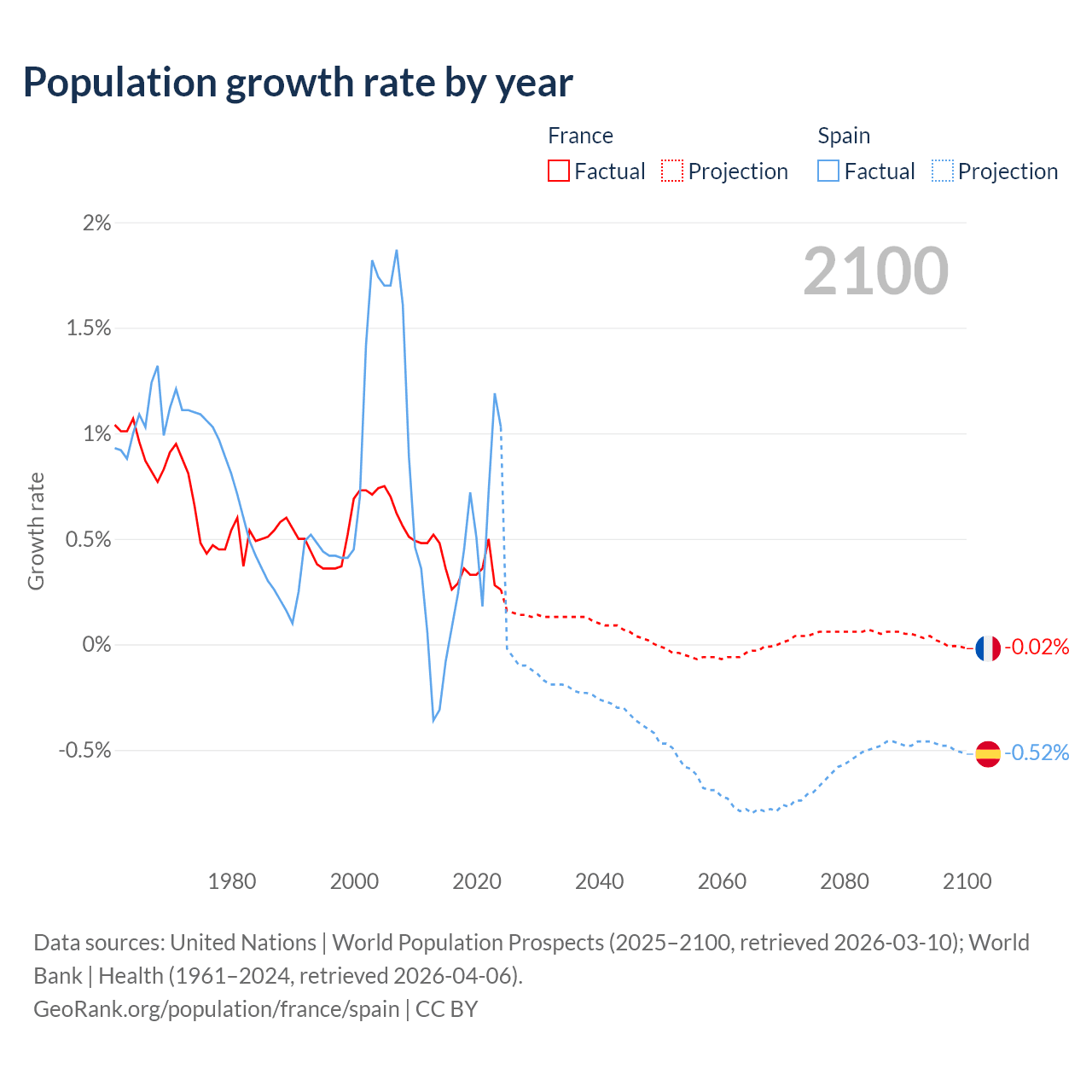 - For the last 10 years, France has had an average growth rate of +0.35% per year vs +0.43% in Spain.