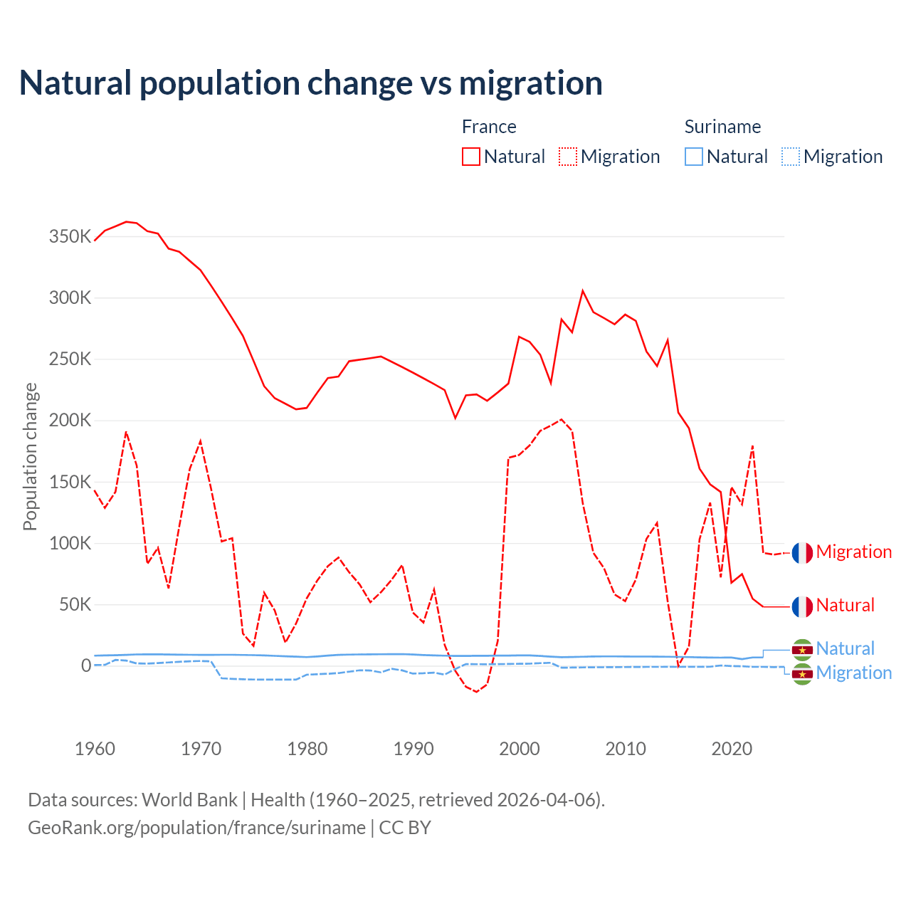 Over the last 10 years, 59.5% of the population change in France is from natural causes (a gain of 1,359,540 people) and 40.5% is from migration (a gain of 923,723 people). In Suriname 90.3% is from natural causes (a gain of 66,709 people) and 9.72% is from migration (a loss of 7,185 people).