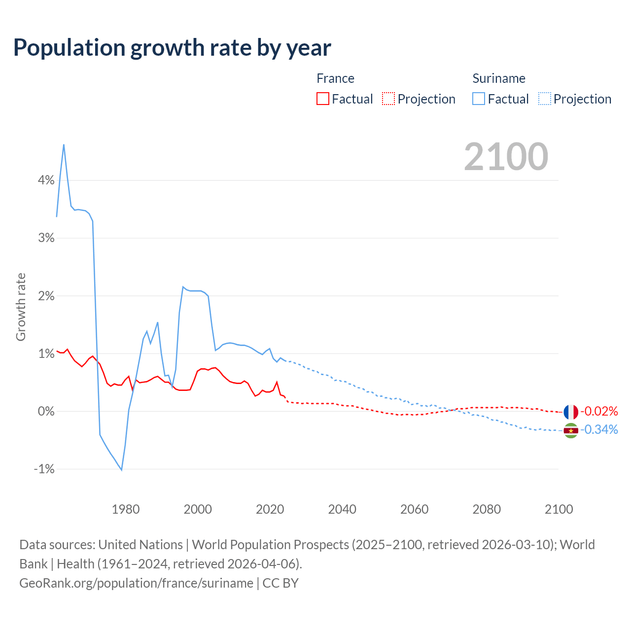- For the last 10 years, France has had an average growth rate of +0.35% per year vs +0.99% in Suriname.
