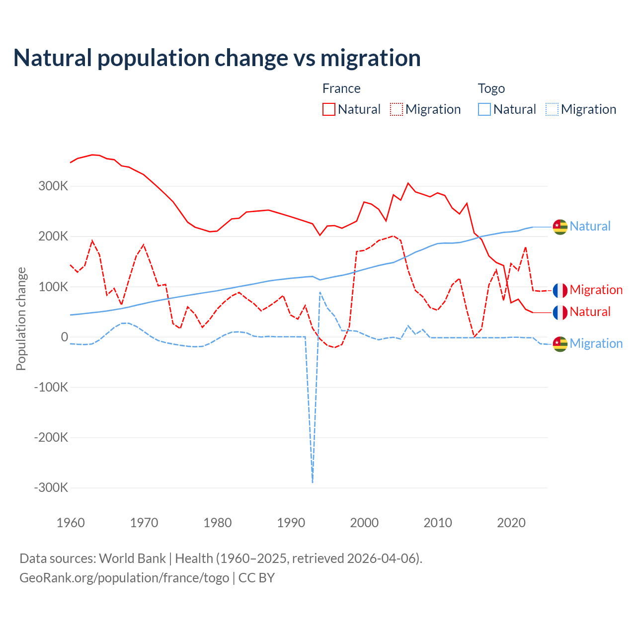 Over the last 10 years, 59.5% of the population change in France is from natural causes (a gain of 1,359,540 people) and 40.5% is from migration (a gain of 923,723 people). In Togo 99.1% is from natural causes (a gain of 2,052,115 people) and 0.86% is from migration (a loss of 17,852 people).