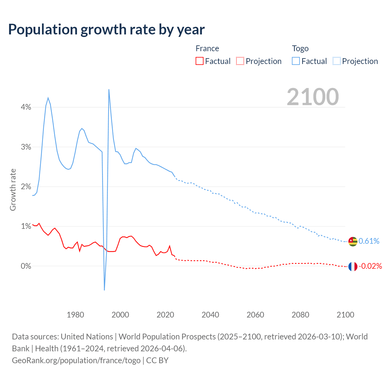 - For the last 10 years, France has had an average growth rate of +0.35% per year vs +2.46% in Togo.