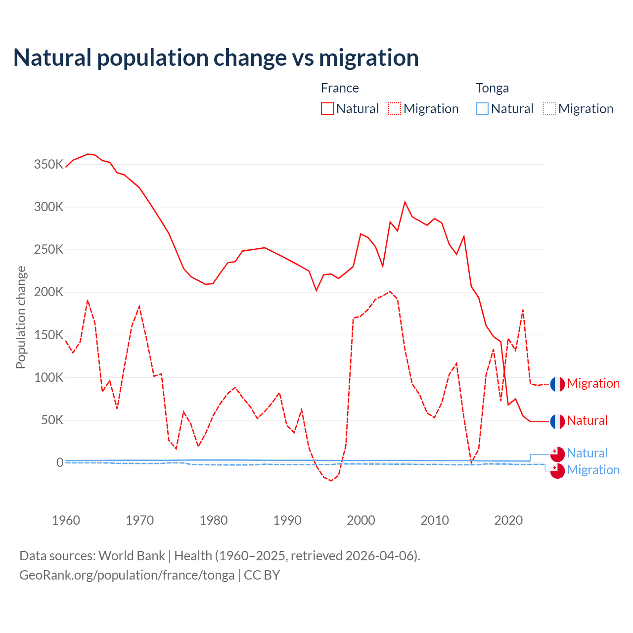 Over the last 10 years, 59.5% of the population change in France is from natural causes (a gain of 1,359,540 people) and 40.5% is from migration (a gain of 923,723 people). In Tonga 46.9% is from natural causes (a gain of 18,919 people) and 53.1% is from migration (a loss of 21,384 people).
