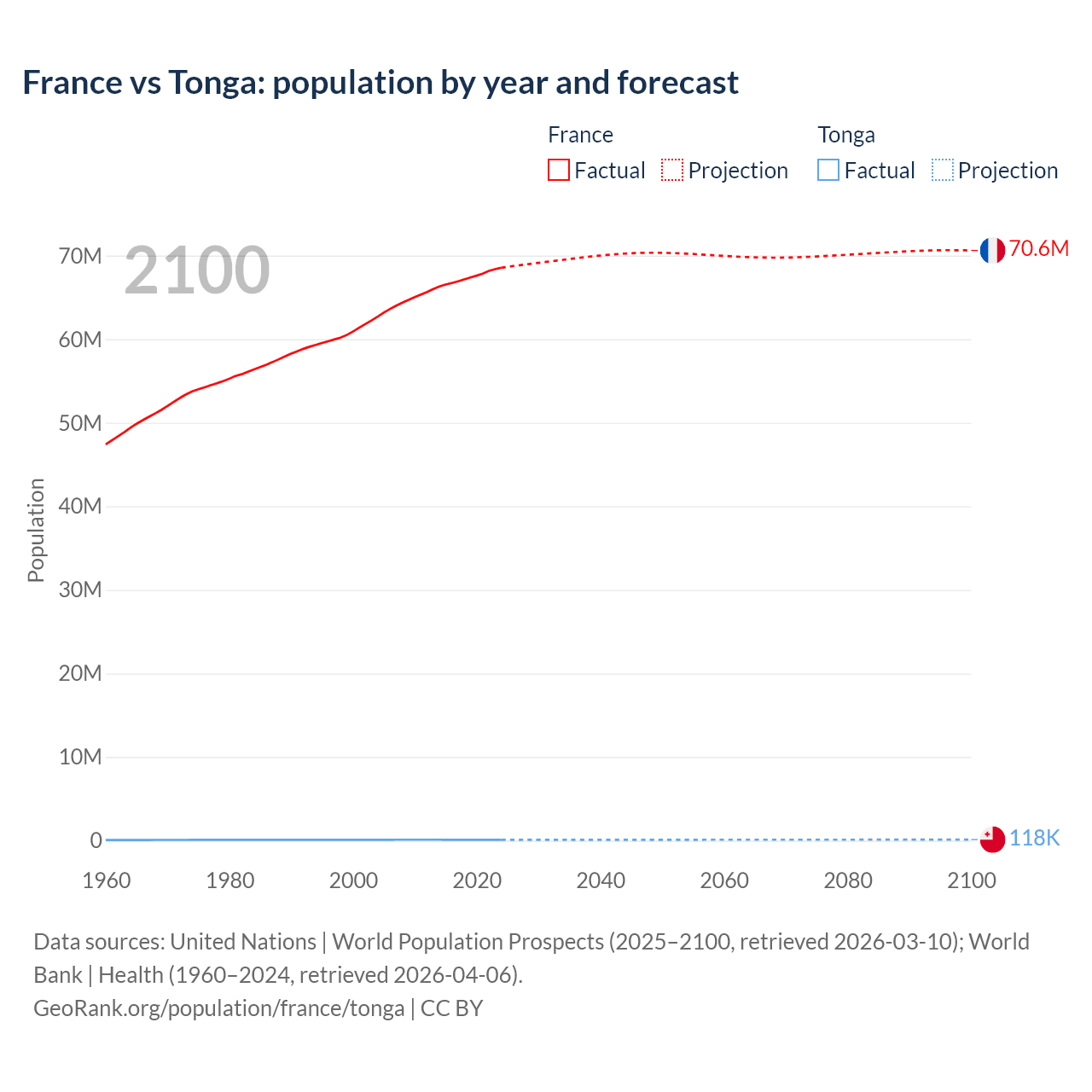 France vs Tonga: population by year and forecast