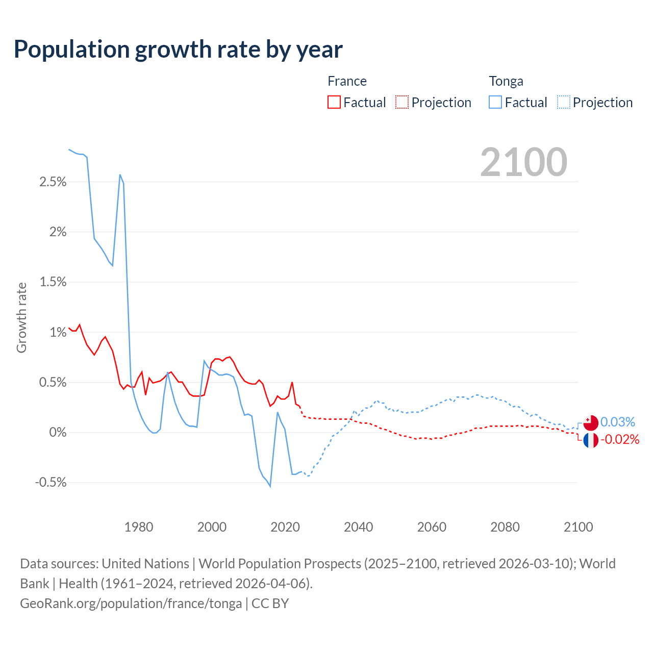 - For the last 10 years, France has had an average growth rate of +0.35% per year vs -0.25% in Tonga.