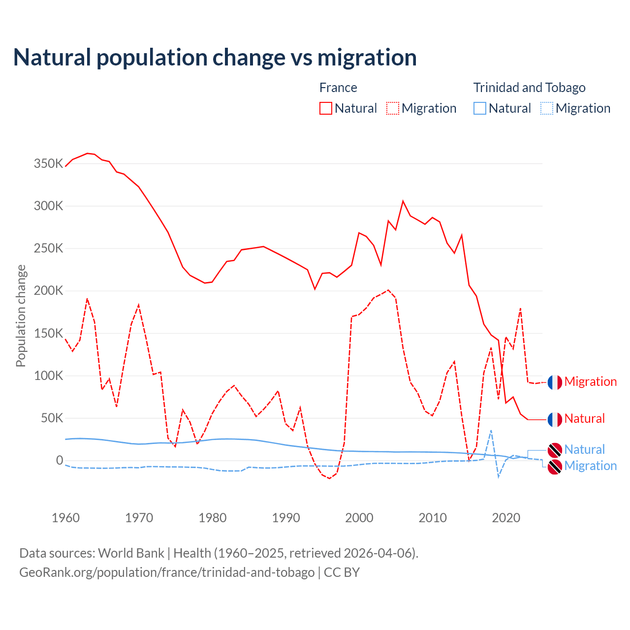 Over the last 10 years, 59.5% of the population change in France is from natural causes (a gain of 1,359,540 people) and 40.5% is from migration (a gain of 923,723 people). In Trinidad and Tobago 66% is from natural causes (a gain of 55,887 people) and 34% is from migration (a gain of 28,785 people).