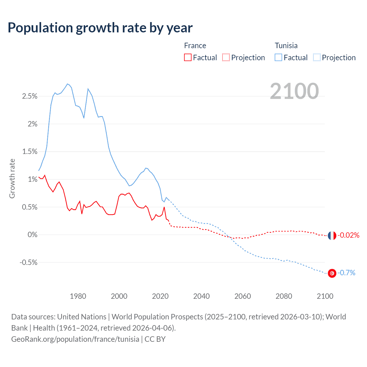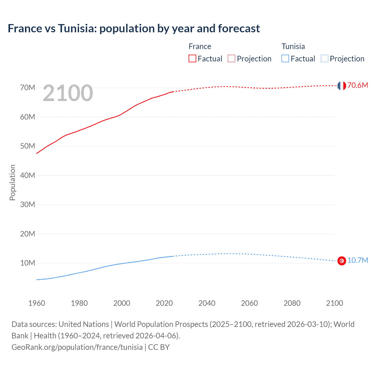 France vs Tunisia: population by year and forecast