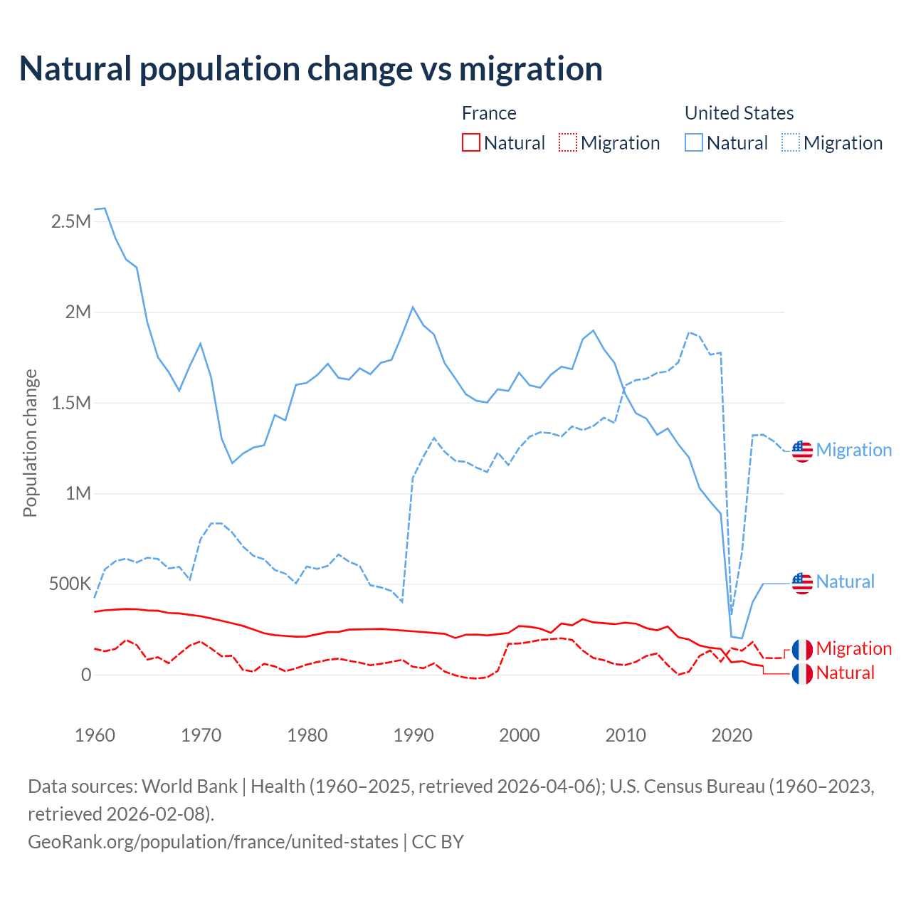 Over the last 10 years, 59.5% of the population change in France is from natural causes (a gain of 1,359,540 people) and 40.5% is from migration (a gain of 923,723 people). In the United States 35.8% is from natural causes (a gain of 8,005,866 people) and 64.2% is from migration (a gain of 14,334,286 people).