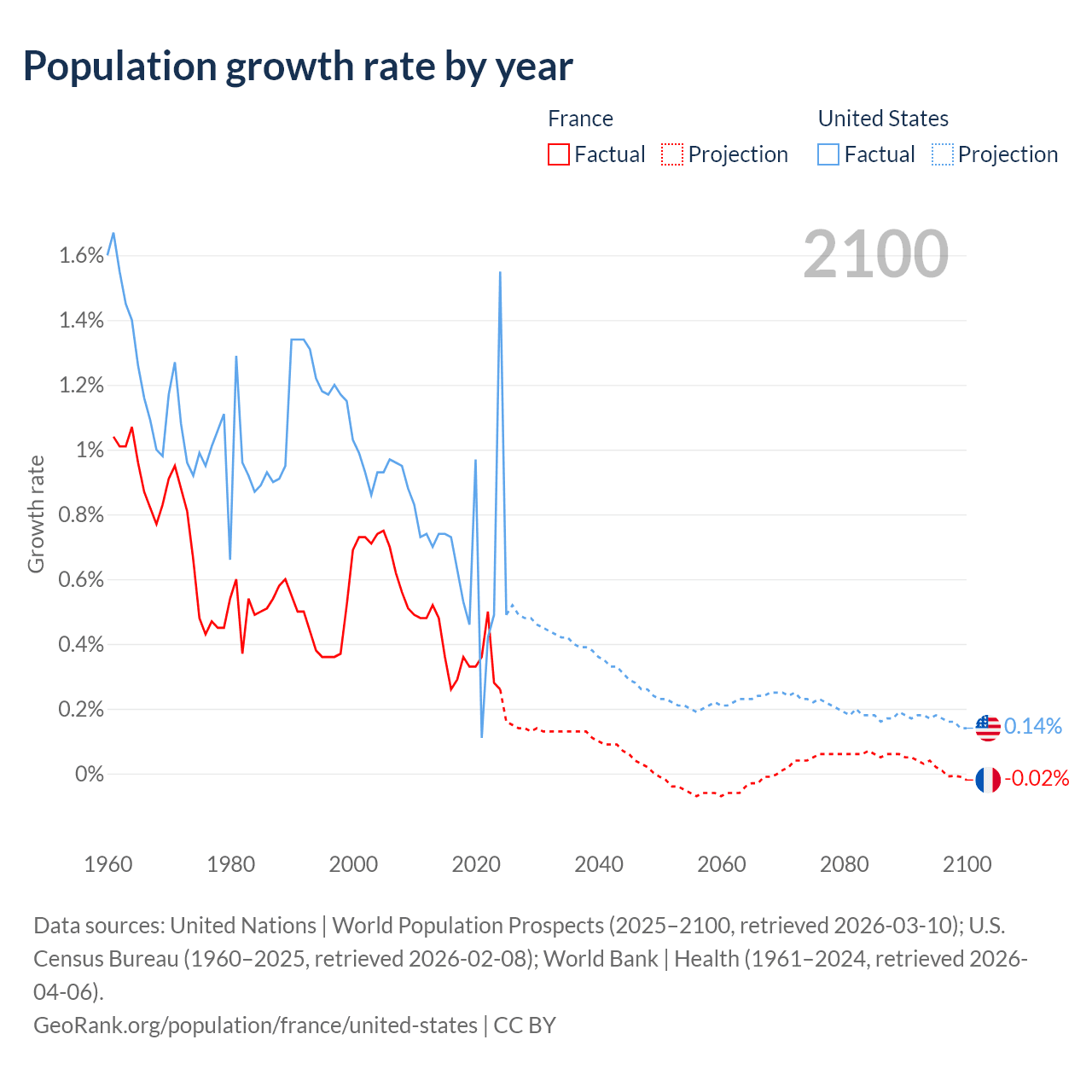 - For the last 10 years, France has had an average growth rate of +0.35% per year vs +0.65% in the United States.