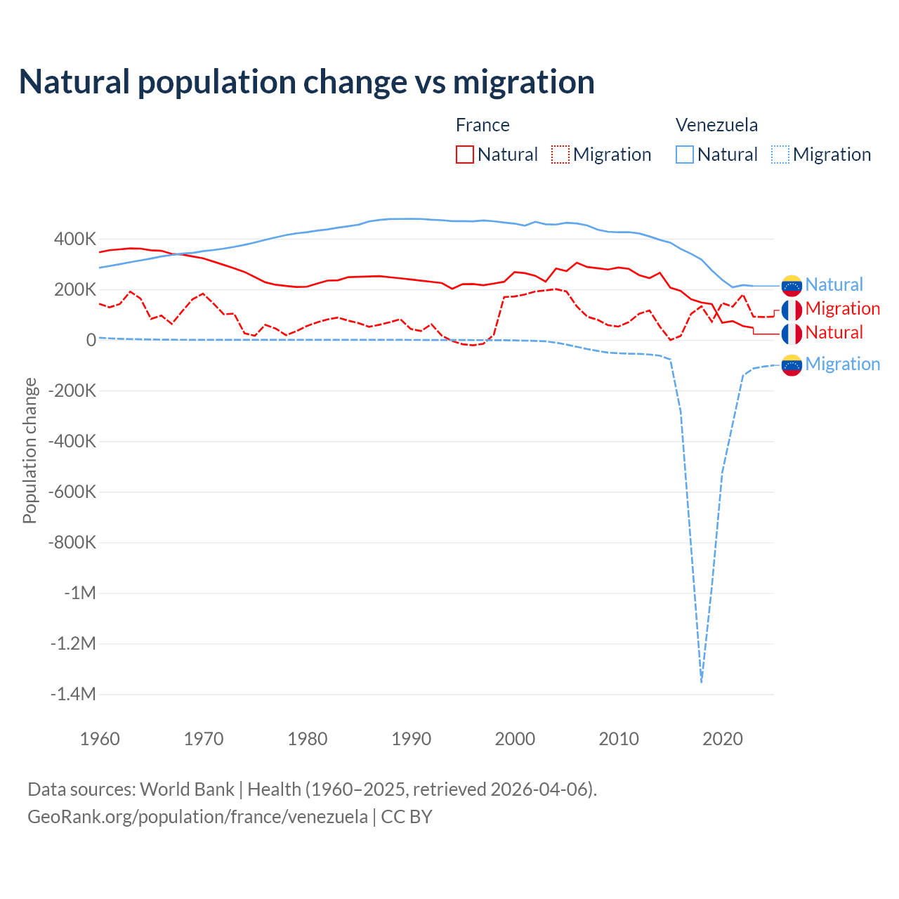 Over the last 10 years, 59.5% of the population change in France is from natural causes (a gain of 1,359,540 people) and 40.5% is from migration (a gain of 923,723 people). In Venezuela 38.6% is from natural causes (a gain of 2,946,257 people) and 61.4% is from migration (a loss of 4,683,227 people).