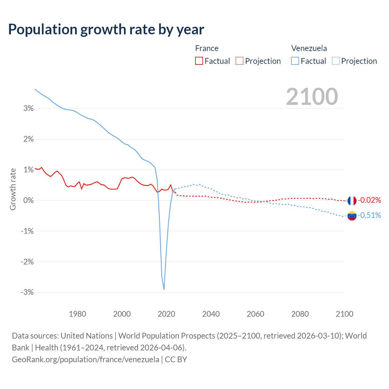 - For the last 10 years, France has had an average growth rate of +0.35% per year vs -0.46% in Venezuela.