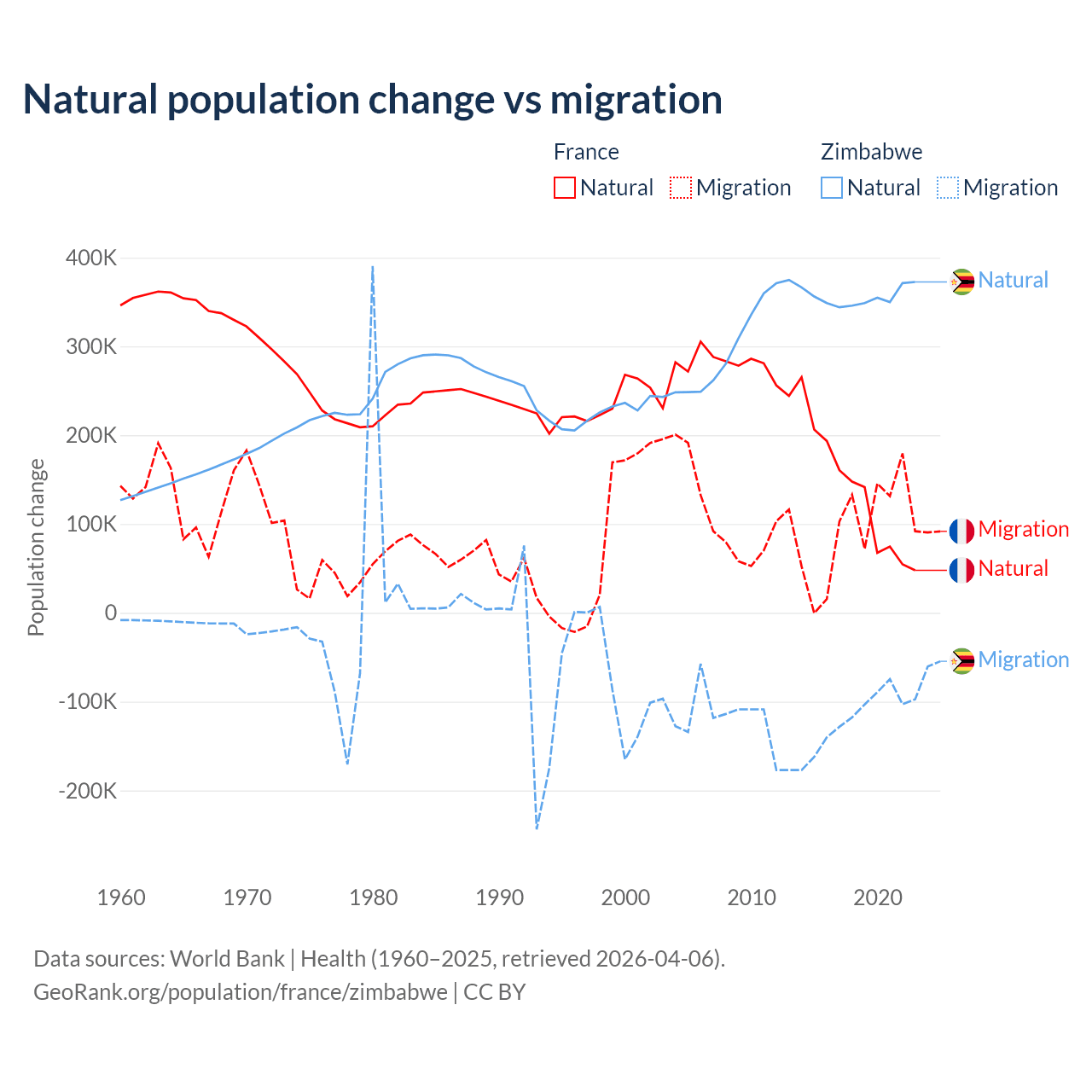 Over the last 10 years, 59.5% of the population change in France is from natural causes (a gain of 1,359,540 people) and 40.5% is from migration (a gain of 923,723 people). In Zimbabwe 74.9% is from natural causes (a gain of 3,558,487 people) and 25.1% is from migration (a loss of 1,192,807 people).