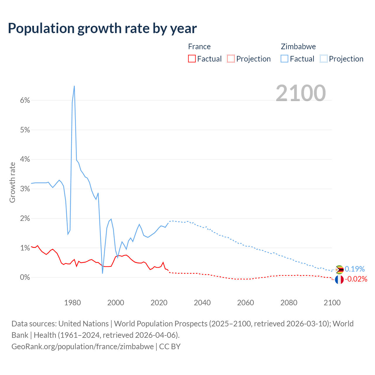 - For the last 10 years, France has had an average growth rate of +0.35% per year vs +1.57% in Zimbabwe.