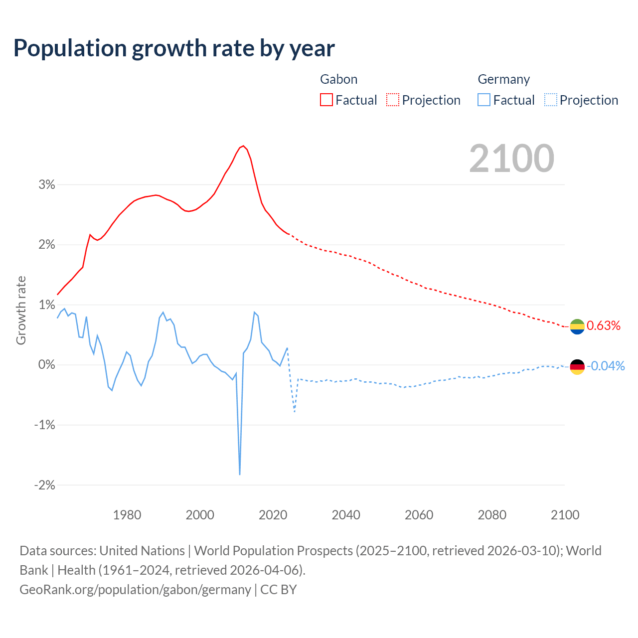 - For the last 10 years, Gabon has had an average growth rate of +2.61% per year vs +0.32% in Germany.