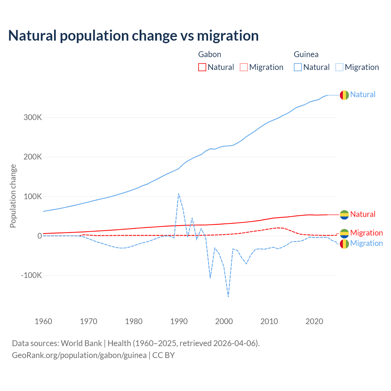Over the last 10 years, 91.1% of the population change in Gabon is from natural causes (a gain of 515,484 people) and 8.86% is from migration (a gain of 50,119 people). In Guinea 97.2% is from natural causes (a gain of 3,346,936 people) and 2.76% is from migration (a loss of 94,924 people).