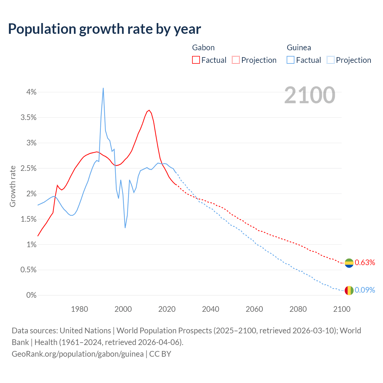 - For the last 10 years, Gabon has had an average growth rate of +2.61% per year vs +2.54% in Guinea.