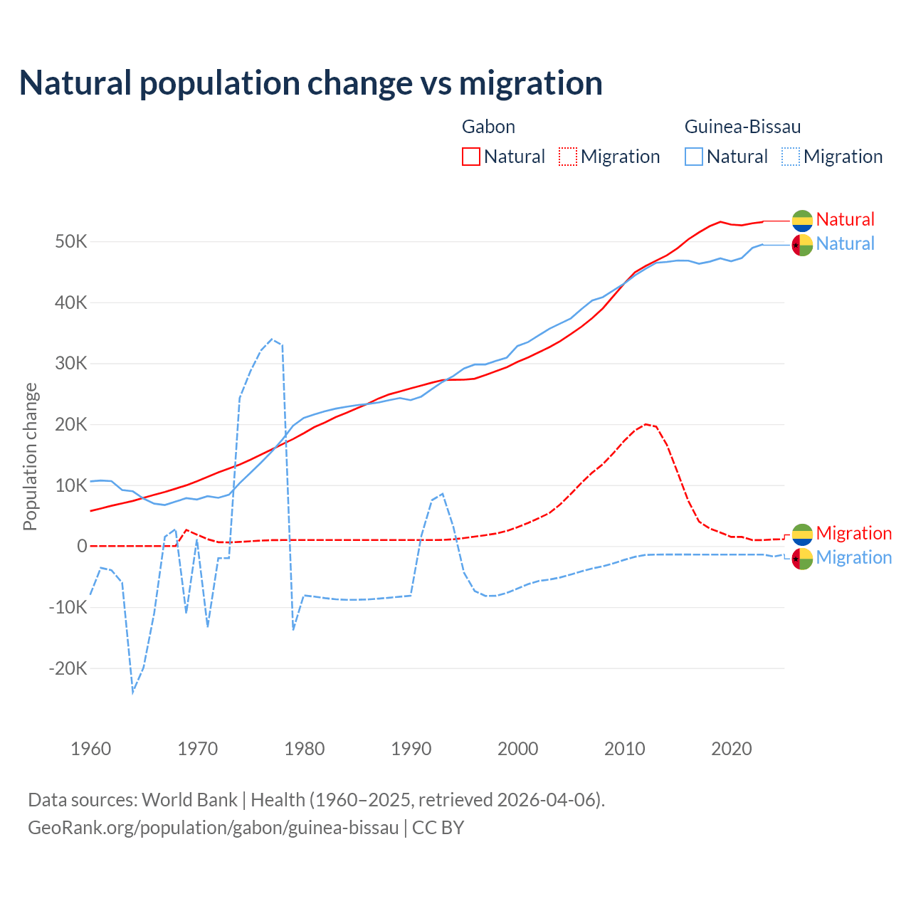 Over the last 10 years, 91.1% of the population change in Gabon is from natural causes (a gain of 515,484 people) and 8.86% is from migration (a gain of 50,119 people). In Guinea-Bissau 97.1% is from natural causes (a gain of 472,826 people) and 2.87% is from migration (a loss of 13,956 people).