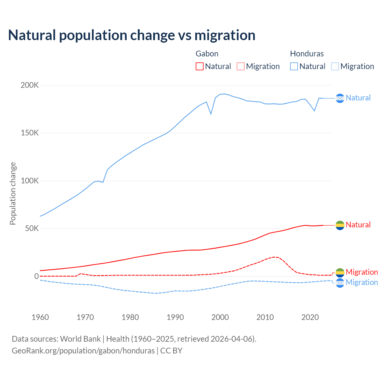 Over the last 10 years, 91.1% of the population change in Gabon is from natural causes (a gain of 515,484 people) and 8.86% is from migration (a gain of 50,119 people). In Honduras 96.7% is from natural causes (a gain of 1,821,125 people) and 3.29% is from migration (a loss of 61,965 people).