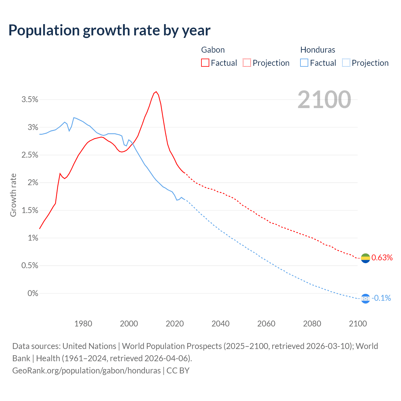 - For the last 10 years, Gabon has had an average growth rate of +2.61% per year vs +1.81% in Honduras.