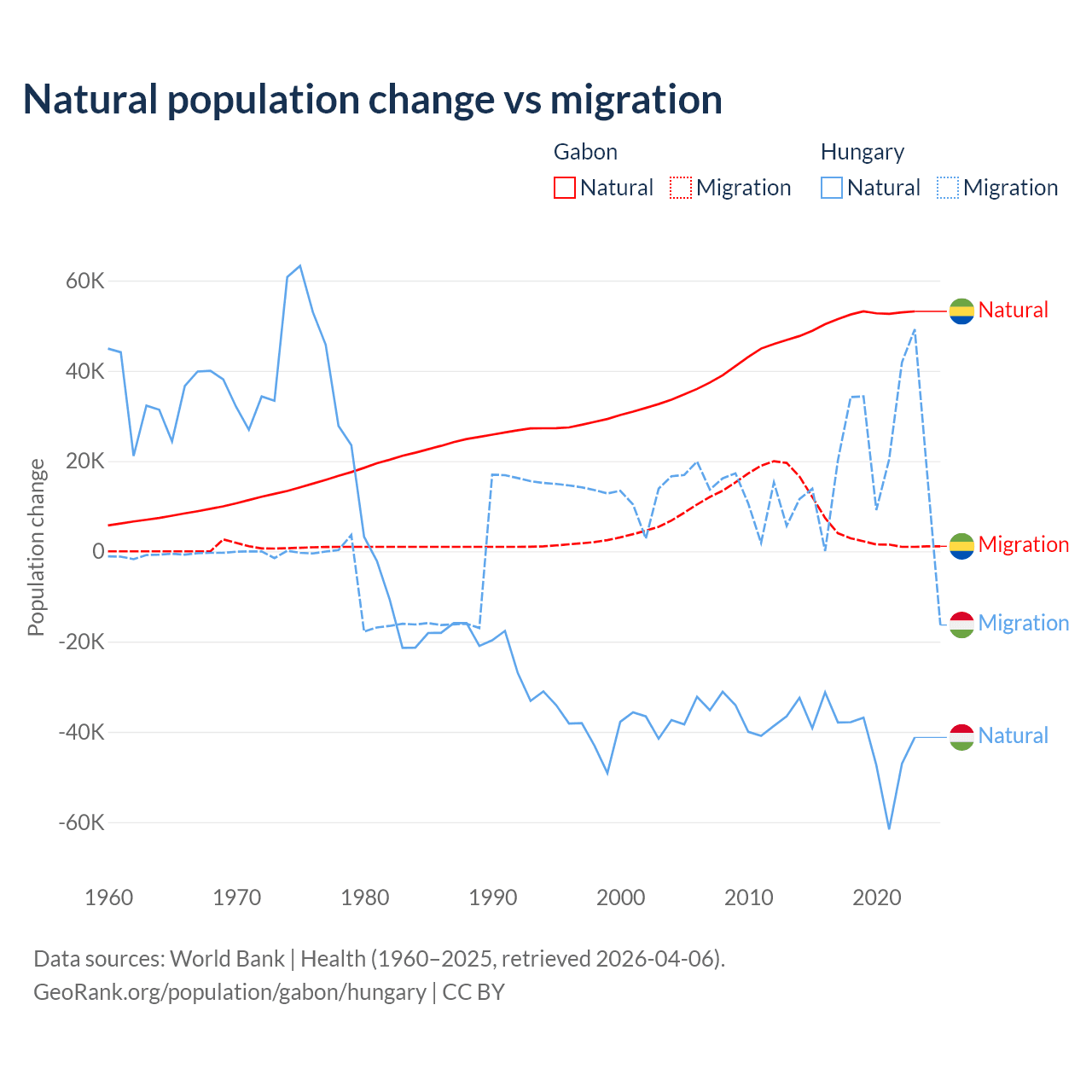 Over the last 10 years, 91.1% of the population change in Gabon is from natural causes (a gain of 515,484 people) and 8.86% is from migration (a gain of 50,119 people). In Hungary 63.7% is from natural causes (a loss of 412,838 people) and 36.3% is from migration (a gain of 234,837 people).