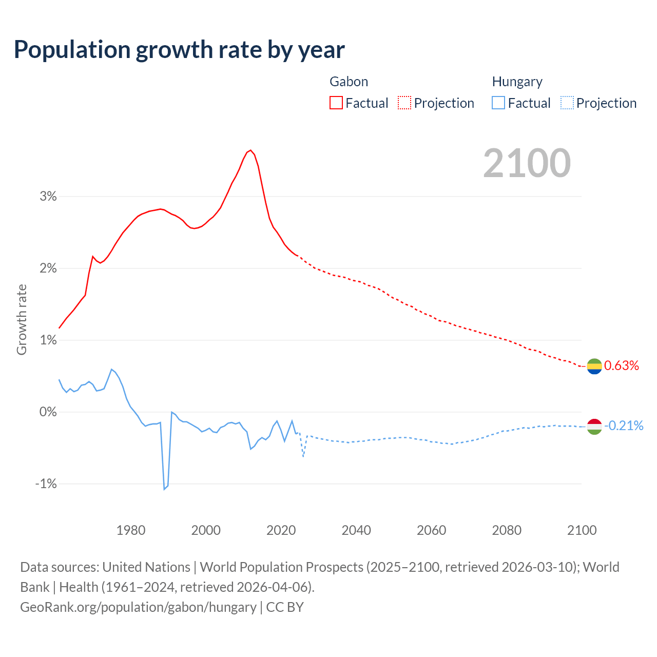 - For the last 10 years, Gabon has had an average growth rate of +2.61% per year vs -0.29% in Hungary.