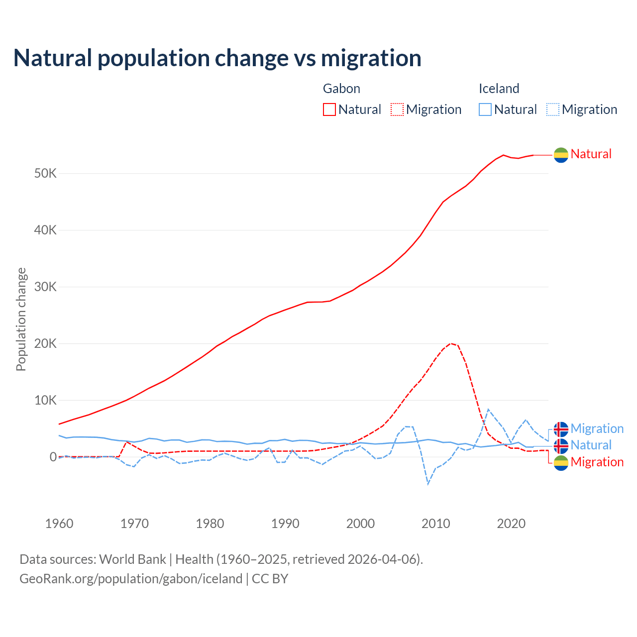 Over the last 10 years, 91.1% of the population change in Gabon is from natural causes (a gain of 515,484 people) and 8.86% is from migration (a gain of 50,119 people). In Iceland 30.7% is from natural causes (a gain of 20,128 people) and 69.3% is from migration (a gain of 45,356 people).