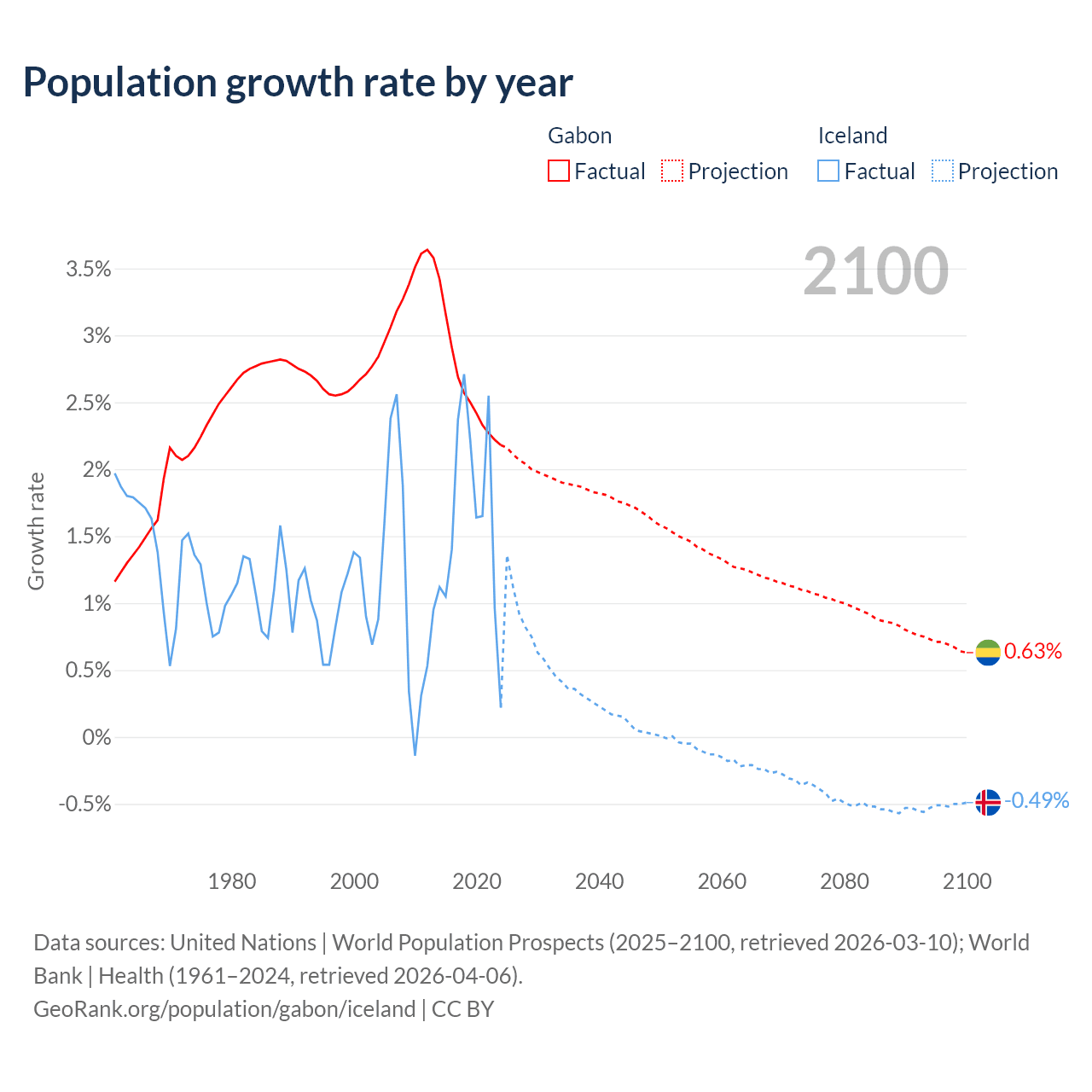 - For the last 10 years, Gabon has had an average growth rate of +2.61% per year vs +1.63% in Iceland.