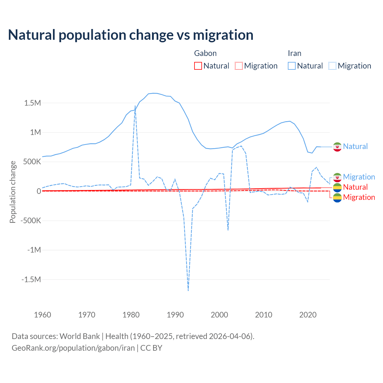 Over the last 10 years, 91.1% of the population change in Gabon is from natural causes (a gain of 515,484 people) and 8.86% is from migration (a gain of 50,119 people). In Iran 92.5% is from natural causes (a gain of 9,405,860 people) and 7.46% is from migration (a gain of 757,979 people).