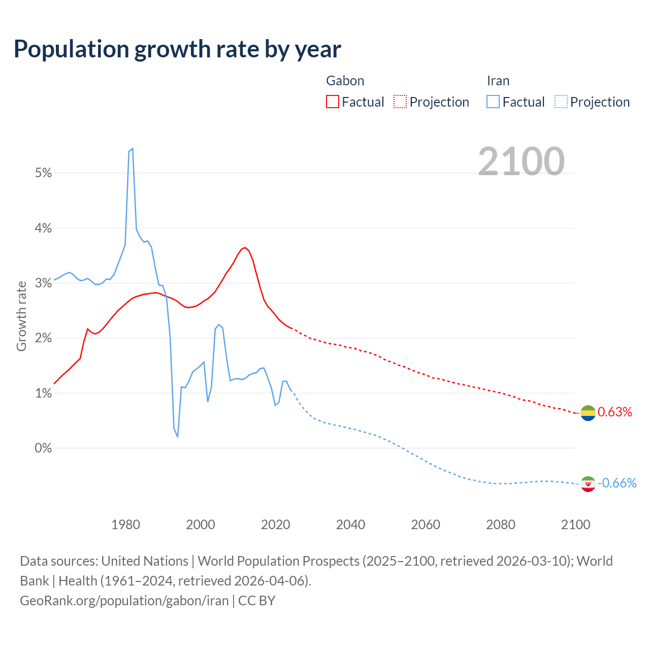 - For the last 10 years, Gabon has had an average growth rate of +2.61% per year vs +1.19% in Iran.