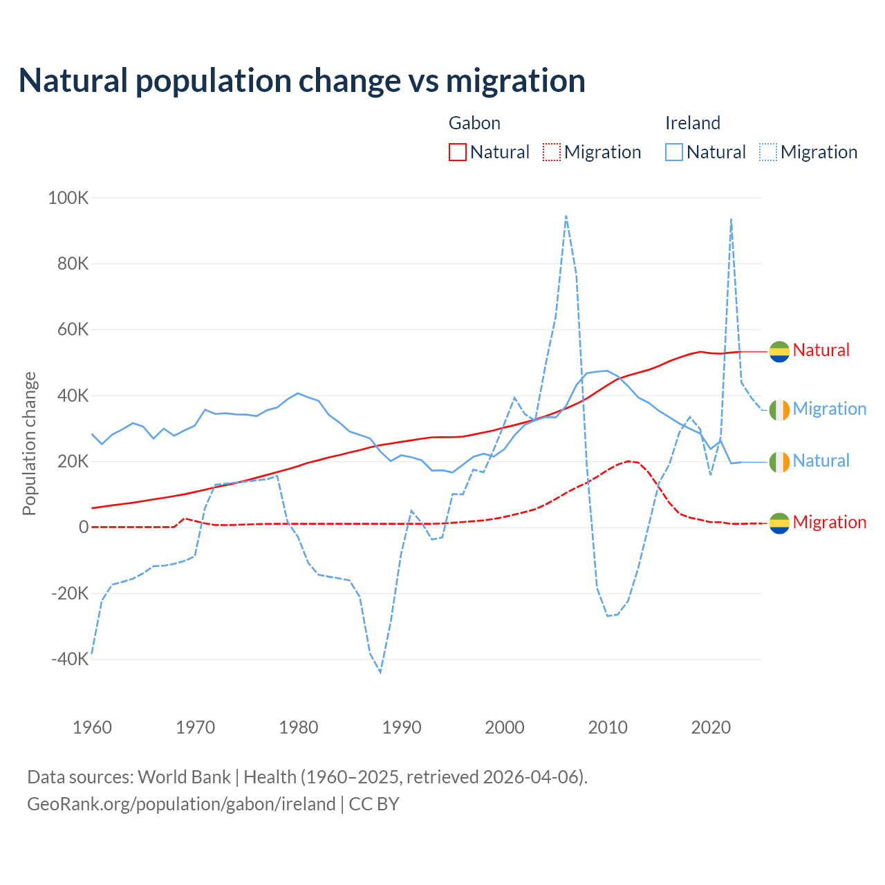 Over the last 10 years, 91.1% of the population change in Gabon is from natural causes (a gain of 515,484 people) and 8.86% is from migration (a gain of 50,119 people). In Ireland 48.2% is from natural causes (a gain of 284,644 people) and 51.8% is from migration (a gain of 305,297 people).