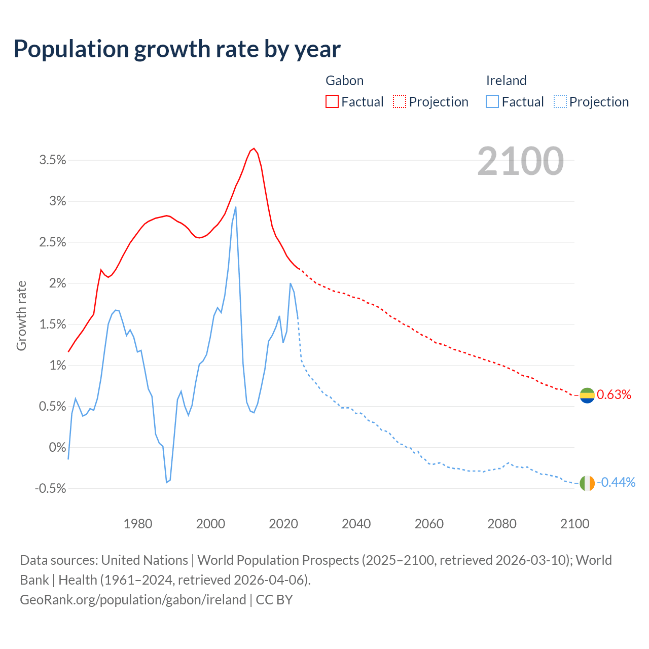 - For the last 10 years, Gabon has had an average growth rate of +2.61% per year vs +1.41% in Ireland.