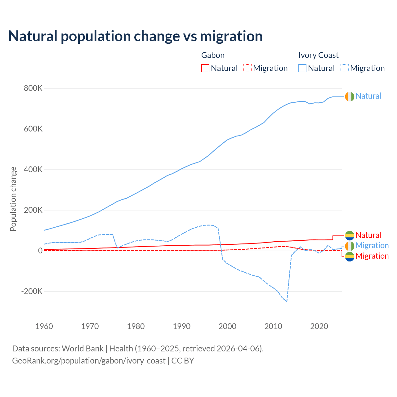 Over the last 10 years, 91.1% of the population change in Gabon is from natural causes (a gain of 515,484 people) and 8.86% is from migration (a gain of 50,119 people). In Ivory Coast 99.7% is from natural causes (a gain of 7,348,944 people) and 0.33% is from migration (a gain of 24,432 people).