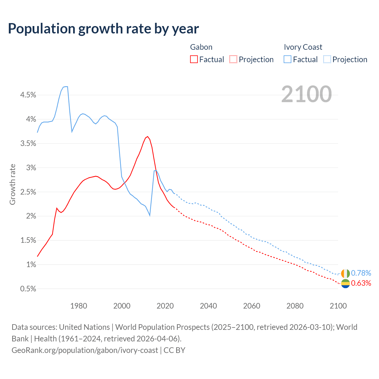 - For the last 10 years, Gabon has had an average growth rate of +2.61% per year vs +2.65% in Ivory Coast.